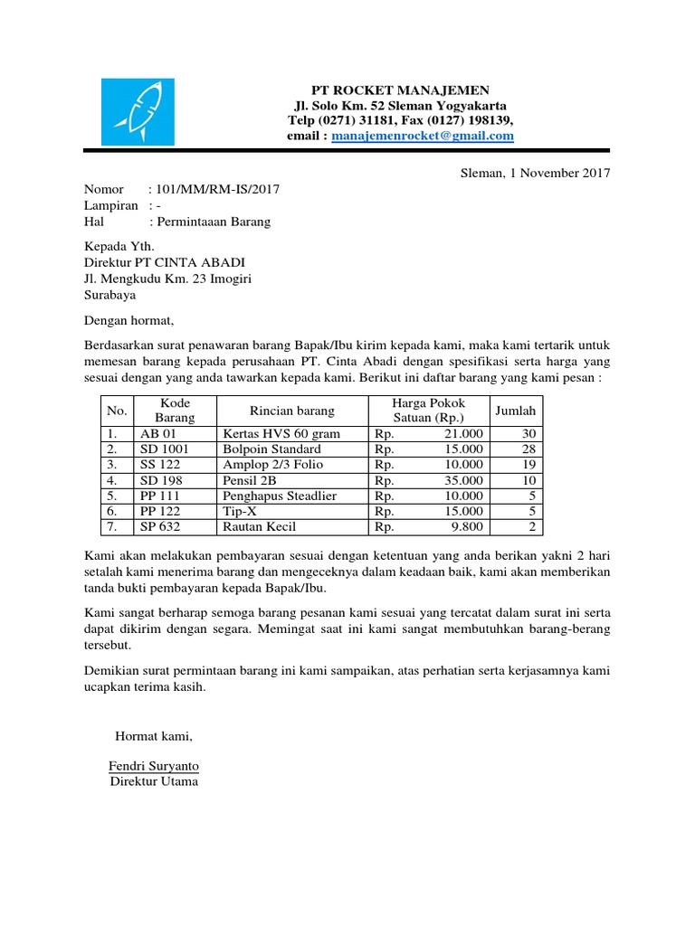 Buatlah 7 Contoh Surat Permintaan Barang Tipe Gambar jpg Dimensi Gambar 1024 x 768 px Besaran Gambar 4793 KiB Lisensi. Dengan hormat Dengan senang hati kami informasikan bahwa perusahaan kami sedang membuka cabang baru di Jl. Contoh Surat Pesanan Barang Yang Benar Hallo bro-sis sesuai dengan judul artikel yang memang topiknya sedang bro-sis cariYa tentunya kali ini Badrul Mozila akan memberikan gambaran dan contoh surat pesanan barang yang benar maupun tahapan alur dari pembuatan surat pesanan barang.